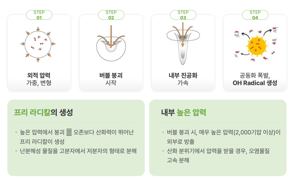 "초음파를 조사하면 매우 다양한 에너지들이 동시에 복합적으로 발생합니다. 버블의 생성, 압력, 온도, 빛, OH-라디칼 등의 이온 물질 활성화 등 매우 다양한 현상들이 동시에 일어나기 때문에 초음파에 대한 연구는 매우 오랫동안 했지만 아직 그 에너지들을 완벽히 제어하는 것은 매우 어려운 일이며 여전히 연구 중인 과제입니다."