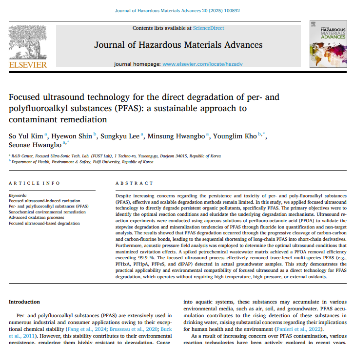 "본 연구는 집속형 초음파 기술을 이용한 PFAS 분해 효율성을 입증하였다. PFOA 실험을 통해 단계적 탈불소화 및 무기화 조건을 최적화하였으며, PFAS 분자는 탄소-탄소 및 탄소-불소 결합의 점진적 절단을 통해 단쇄 유도체로 전환되었다. 이 공정은 고온.고압.외부 산화제 없이 작동하는 실용적으로 지속 가능한 기술로 평가된다."