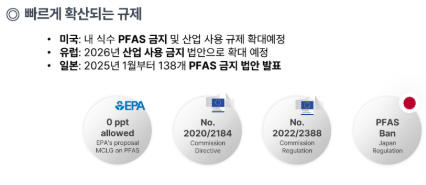 PFAS가 우리의 체내에 유입되는 경로로 확인된 부분은 크게 제품 생산 단계에서의 대기(유해물질 필터 소각)와 식수원(필터를 통과한 나노 단위 유해물질)으로의 유입입니다. 때문에 미국과 유럽에서는 산업규제대상으로 PFAS를 등록하고 관리하고 있습니다.