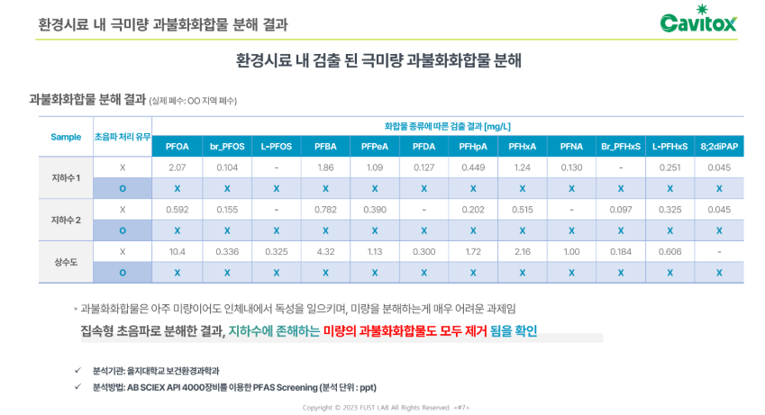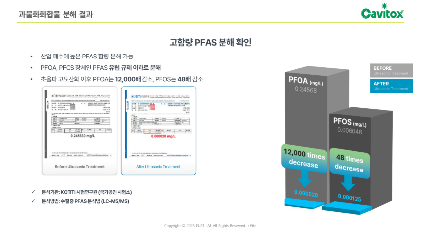 퍼스트랩의 집속형 초음파 기술은 이러한 기업들의 고민을 해결할 수 있습니다. 관련 기술을 적용한 Cavitox 장비를 활용하여 PFAS 물질 중 12종에서 99.99% 분해가 가능하다는 것을 확인할 수 있었습니다. 각 산업의 폐수 배출 설비 최종단에 Cavitox를 연결하면 친환경적으로 해결할 수 있습니다.