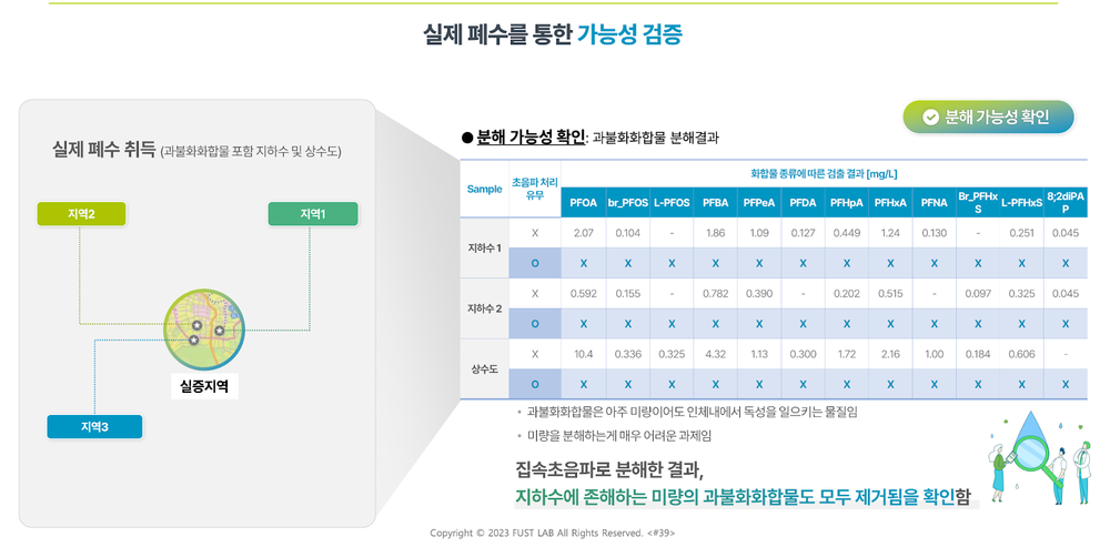 퍼스트랩은 PFAS 과불화화합물의 분해 성능을 확인하기 위해서 실증지역을 선정하고 직접 폐수를 취수하여 분해실험을 실시하였습니다. 각기 다른 오염도의 3개 실험샘플에 대해서 CAVITOX는 12개 모든 PFAS 과불화화합물 물질에 대해서 그 농도가 높은 경우는 물론, 미량으로 존재하는 경우에 대해서도 모두 분해해낼 수 있다는 것을 입증해 냈습니다.