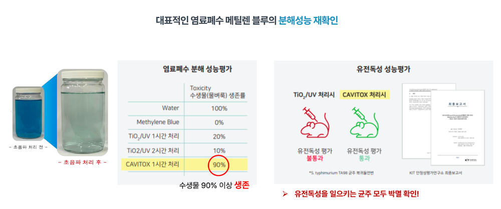이 외에도 다양한 폐수 물질에 대한 분해를 의뢰받고 실험하면서 해결책을 찾아나가고 있습니다. 대표적인 염료폐수에 해당하는 메틸렌 블루에 대한 실험에서도 기존 방식인 TiO2 (이산화티타늄촉매)에 강한 자외선 UV를 조사해서 분해를 촉진하는 방식에 대비하여 극적인 수준의 수생물 생존률을 입증해 낼 수 있었고, 유전독성평가에서도 기존의 촉매반응 분해촉진 방식에 대비하여 해결책으로 제시될 수 있게 되었습니다.